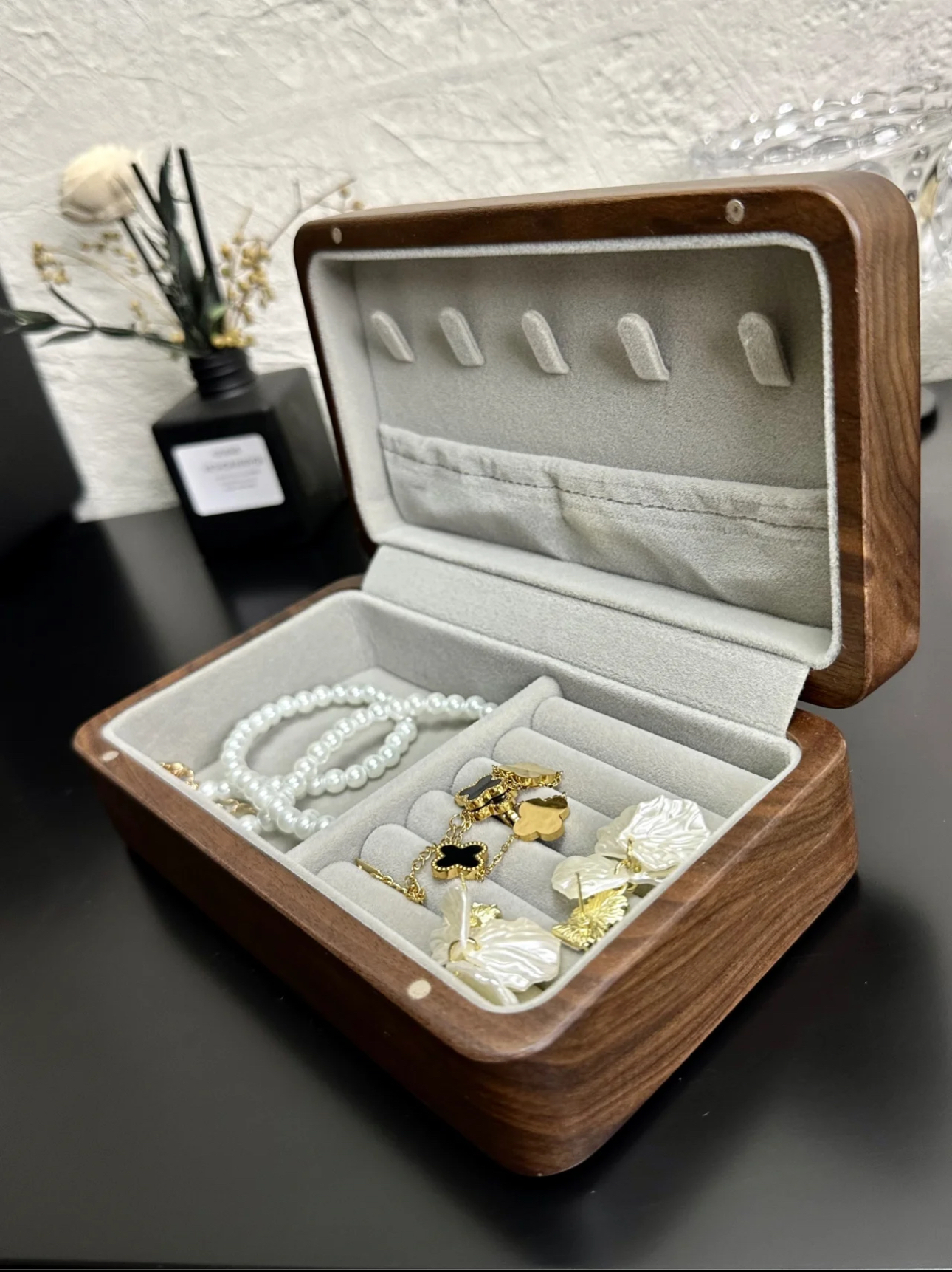 The thoughtful design includes multiple, spacious compartments to store rings, earrings, necklaces, bracelets, and more. Its layout ensures your pieces remain untangled and easy to find. The soft velvet lining inside each compartment protects your jewelry from tarnishes and scratches, so they stay as stunning as the day you bought them. Whether you’re organizing delicate heirlooms or everyday favorites, this storage solution ensures everything is kept pristine and accessible.